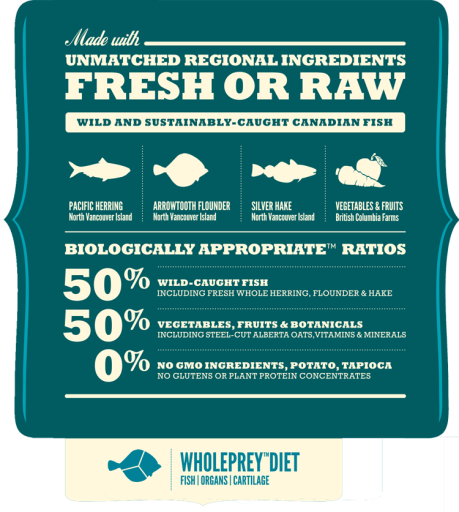 Arenque desidratado (24%), aveia laminada (23%), arenque do Pacífico inteiro fresco (10%), linguado inteiro fresco (6)%, óleo de arenque (6%), óleo de canola extraído a frio, pescada prateada inteira fresca (4%), lentilhas vermelhas inteiras, ervilhas verdes com vagem, lentilhas verdes inteiras, grão de-bico, ervilhas amarelas com vagem, aveia em grão,alfafa amadurecida ao sol, fibra de lentilha, alga laminária castanha desidratada, abóbora fresca, abóbora-almiscarada fresca, pastinaca fresca, couve verde fresca, espinafres frescos, cenouras frescas, maçãs Red Delicious frescas, pêras Bartlett frescas, arenque liofilizado (0.1%), arandos frescos, mirtilos frescos, raiz de chicória, açafrão-das-índias, cardo-mariano, raiz de bardana, alfazema, roseira-silvestre. Aditivos: Vitamina E, B5, Colina, Zinco, Cobre. Naturalmente preservado com Vitamina E.