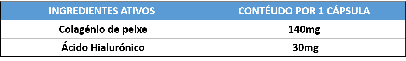 óleo de soja, colágeno de peixe, hialuronato de sódio, água purificada, antioxidante (DL-α-tocoferol)