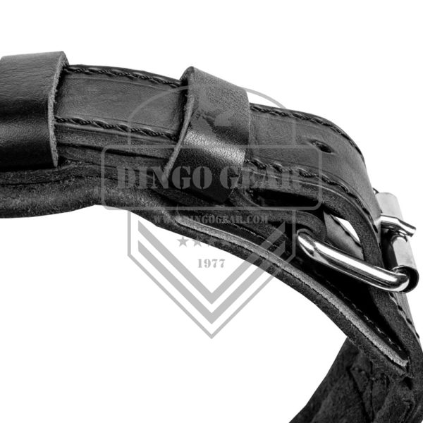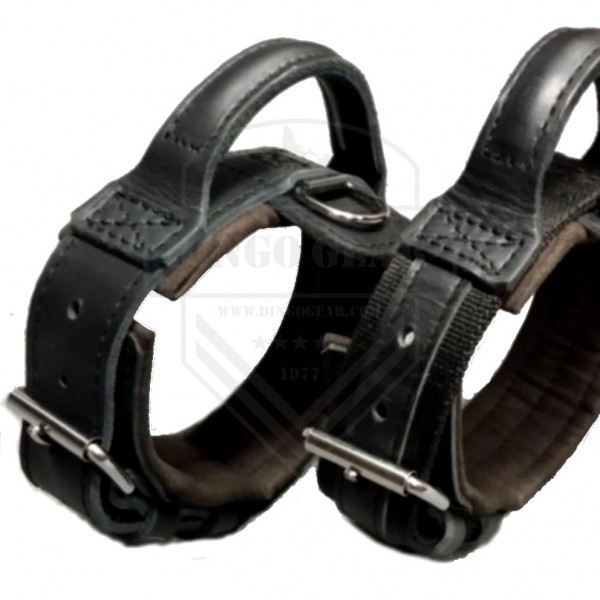 A tira principal da coleira é forrada ao redor de todo o perímetro com um forro muito macio, reduzindo os efeitos desagradáveis de movimentos bruscos enquanto aprende a se defender. A coleira possui acessórios cromados muito duráveis: um clipe e um semicírculo. A colocação do semicírculo permite a fixação simultânea de uma trela ou corda ao mesmo tempo de segurar o cão. Cada um dos acessórios é isolado com um adesivo de couro que impede o metal entrar em contato com a pelagem do cão. A pega de costura dupla, macia e muito confortável, feita de couro natural, facilita o controle do cão. Feito à mão com alta precisão garantindo grande durabilidade.