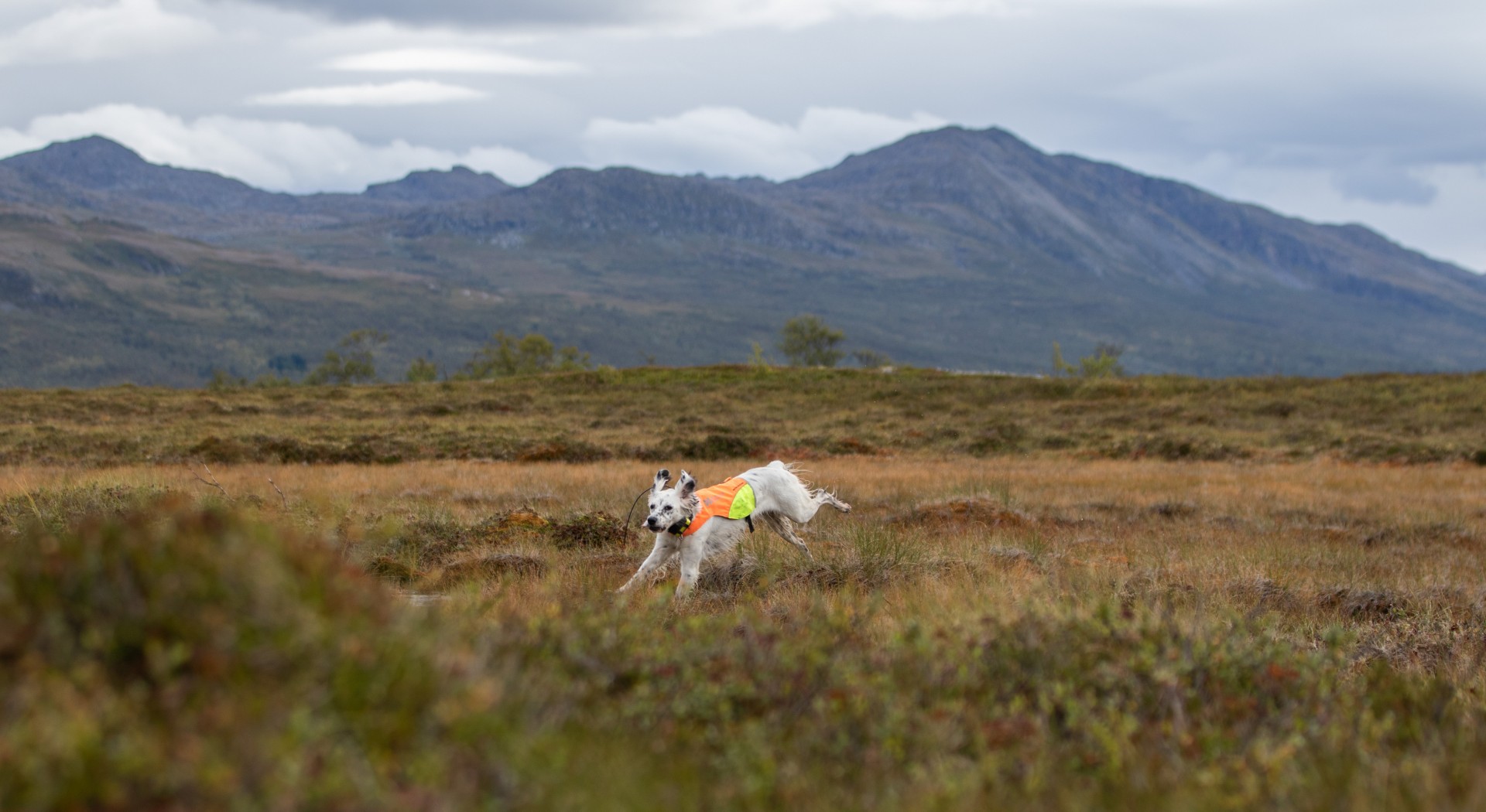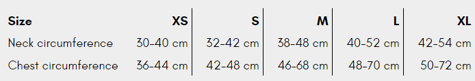 O colete está disponível nos tamanhos XS-XL e se encaixa na maioria das raças de cães de caça.