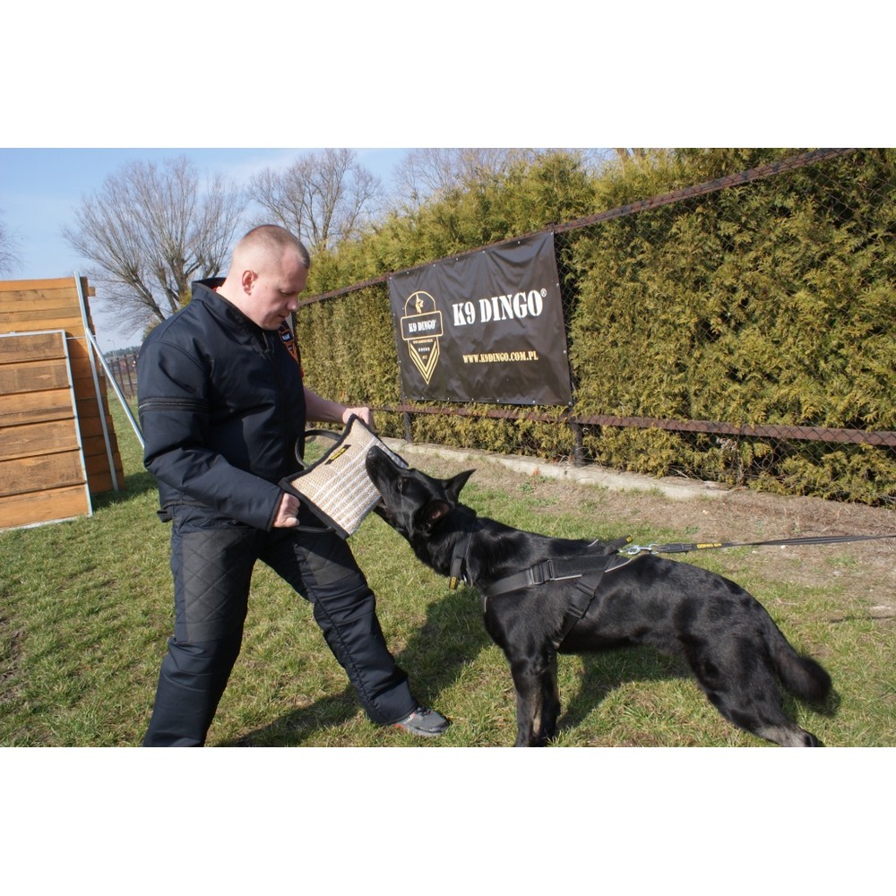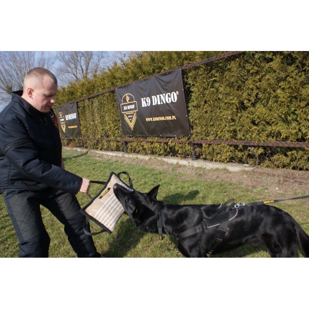 Mordedor reforçado com juta desenhado para trabalhar na aderência correta de cachorros, cães jovens e grandes. Elástico, resistente a mordidas, sujeira e danos. Possui reforço interno no tubo que impede sua deformação. Equipado com três pegas e um anel para prender uma trela ou cabo. Graças à sua resistência, é utilizado por treinadores para treinar cães fortes. Feito à mão com alta precisão, para que seja seguro para o cão e o ajudante.