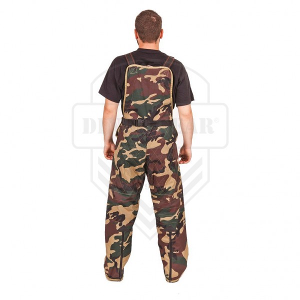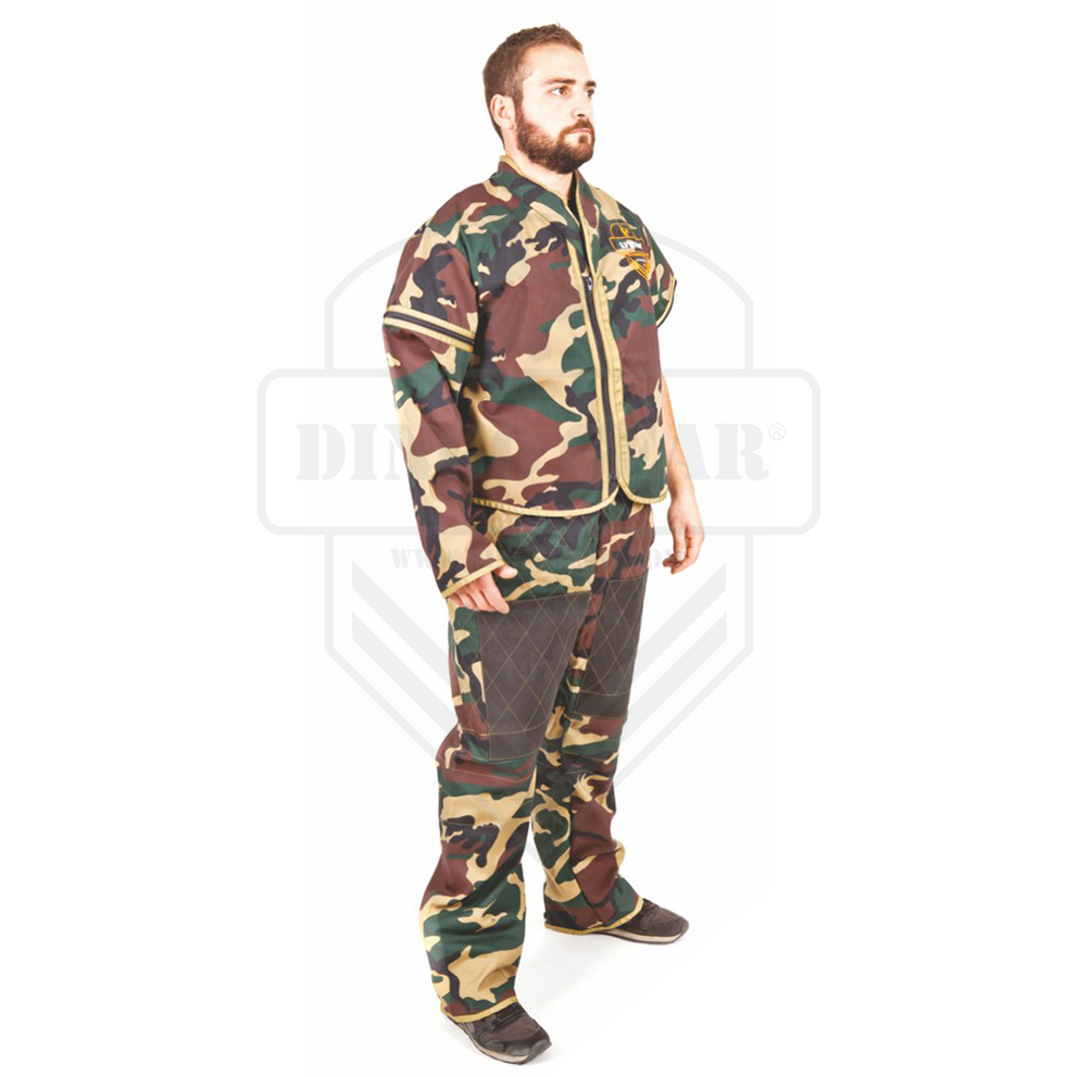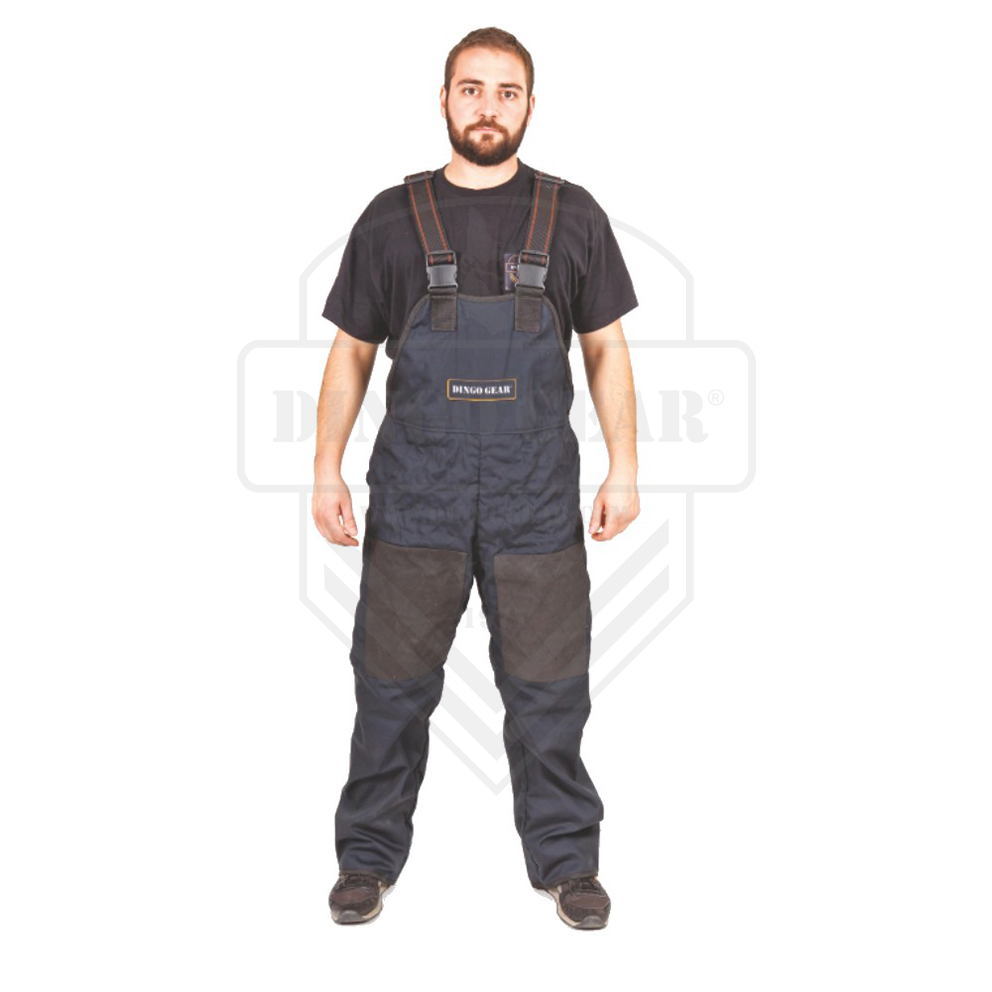 A calça do fato de protecção para treino faze parte de roupa super leve para ripagem, desenhada para treino IPO, K9, etc. O material usado é um tecido de algodão e poliéster (65% Pes; 35% Bw), que é reforçado pela adição de um adicional mais forte a intervalos regulares fibra anti-rasgo. As pernas das calças são acolchoadas e reforçadas com remendos de couro nas coxas. Eles não impedem os movimentos, o que significa que pode trabalhar com cães de maneira ainda mais eficaz.