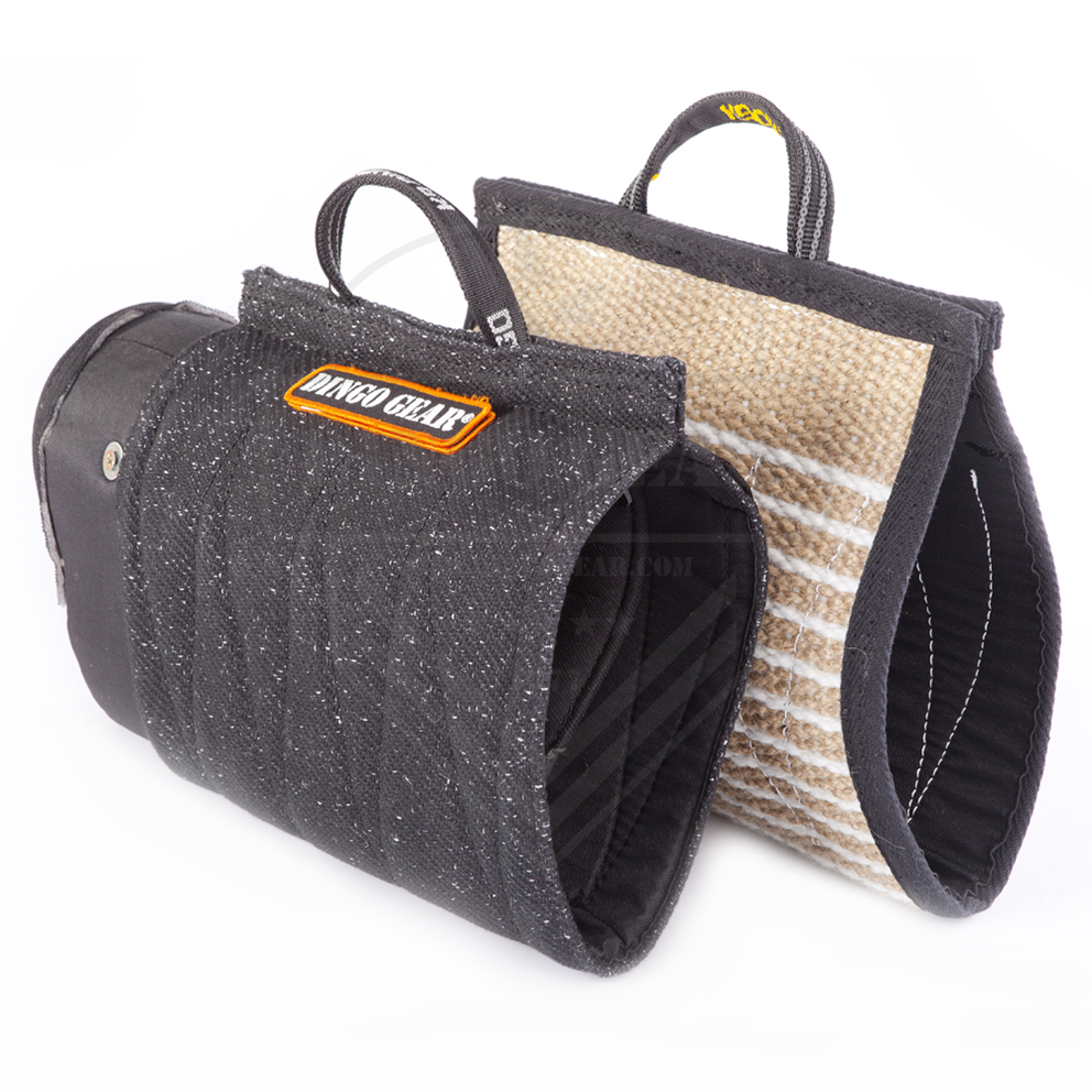 DŻEFI é uma manga curta de treino em jute com capa substituivél, feita para treinar cães jovens e cães adultos. Protege perfeitamente a mão do pulso ao cotovelo. Serve para a mão direita e esquerda. Utilizada por treinadores para desenvolver as habilidades de ataque, defesa ou parado. Feito à mão com alta precisão e cuidado de acordo com os padrões europeus, oferece oportunidades de treino por vários anos. A manga foi feita para trabalhar com uma sobreposição.