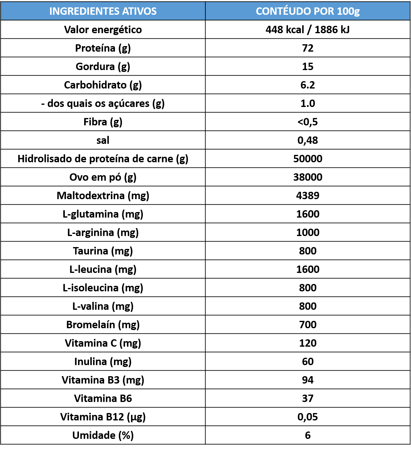 Hidrolisado de proteína bovina, ovo em pó, maltodextrina, L-leucina, L-valina, L-isoleucina, L-glutamina, L-arginina, Taurina, vitamina C (ácido ascórbico), enzima Bromelain, inulina (da chicória), vitamina B3 ( niacina), vitamina B6 (cloridrato de piridoxina), vitamina B12 (metilcobalamina)