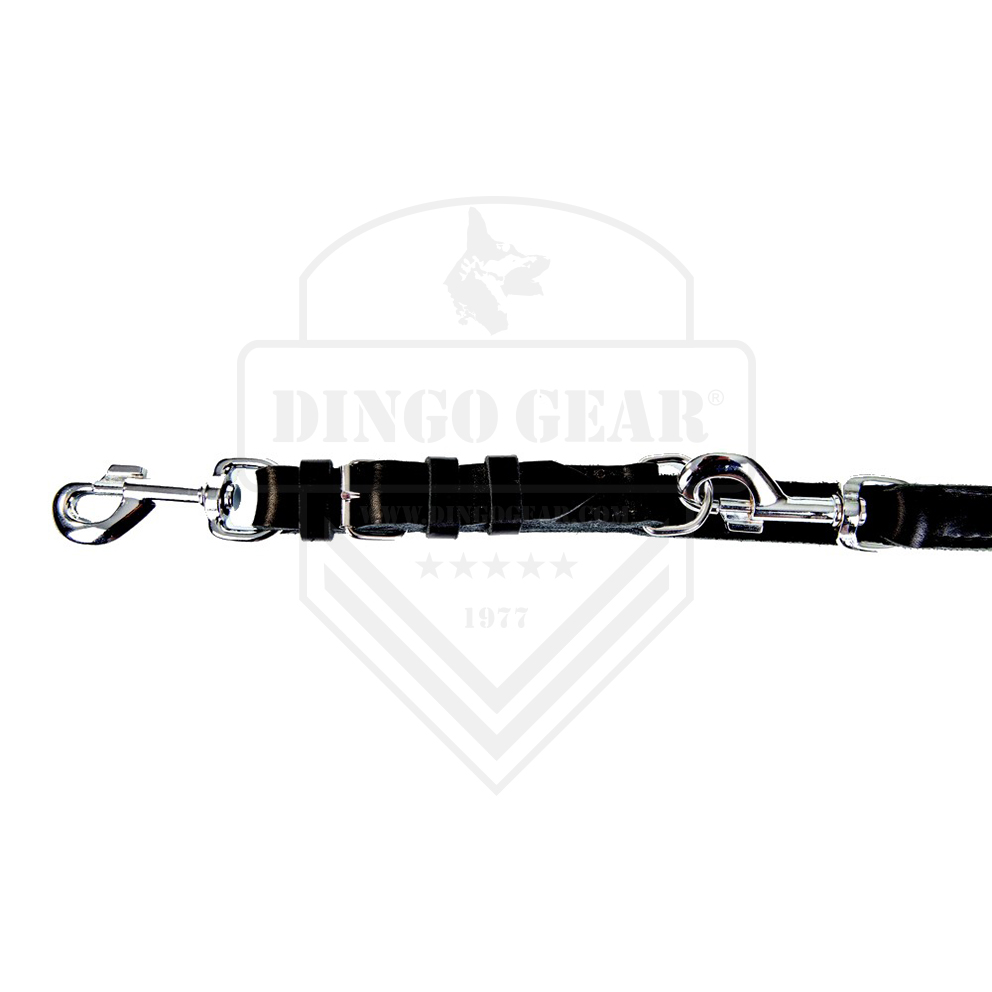 Trela em couro de cor preto com pega ajustável. A largura e o tipo de couro usado proporcionam um atrelar seguro e confortável. Específica para o treino e mordida. Existe em três comprimentos obtidos com o ajuste do mosquetão. Feito à mão com alta precisão garantindo grande durabilidade.